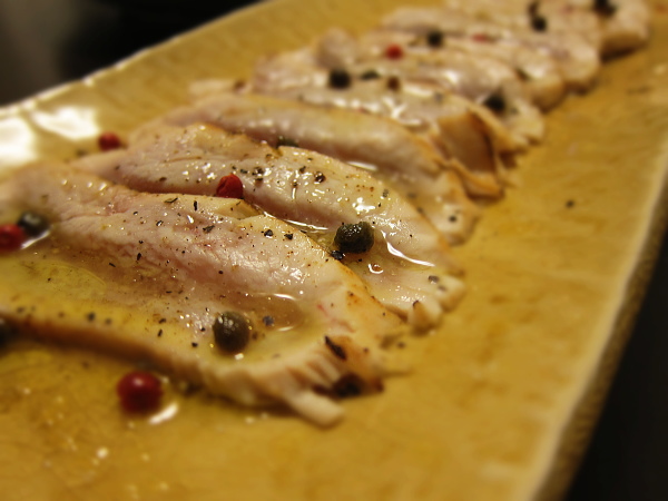 オリーブイルと塩・コショウ・ピンクぺッパー・山椒の実・柚子胡椒を添えると、
