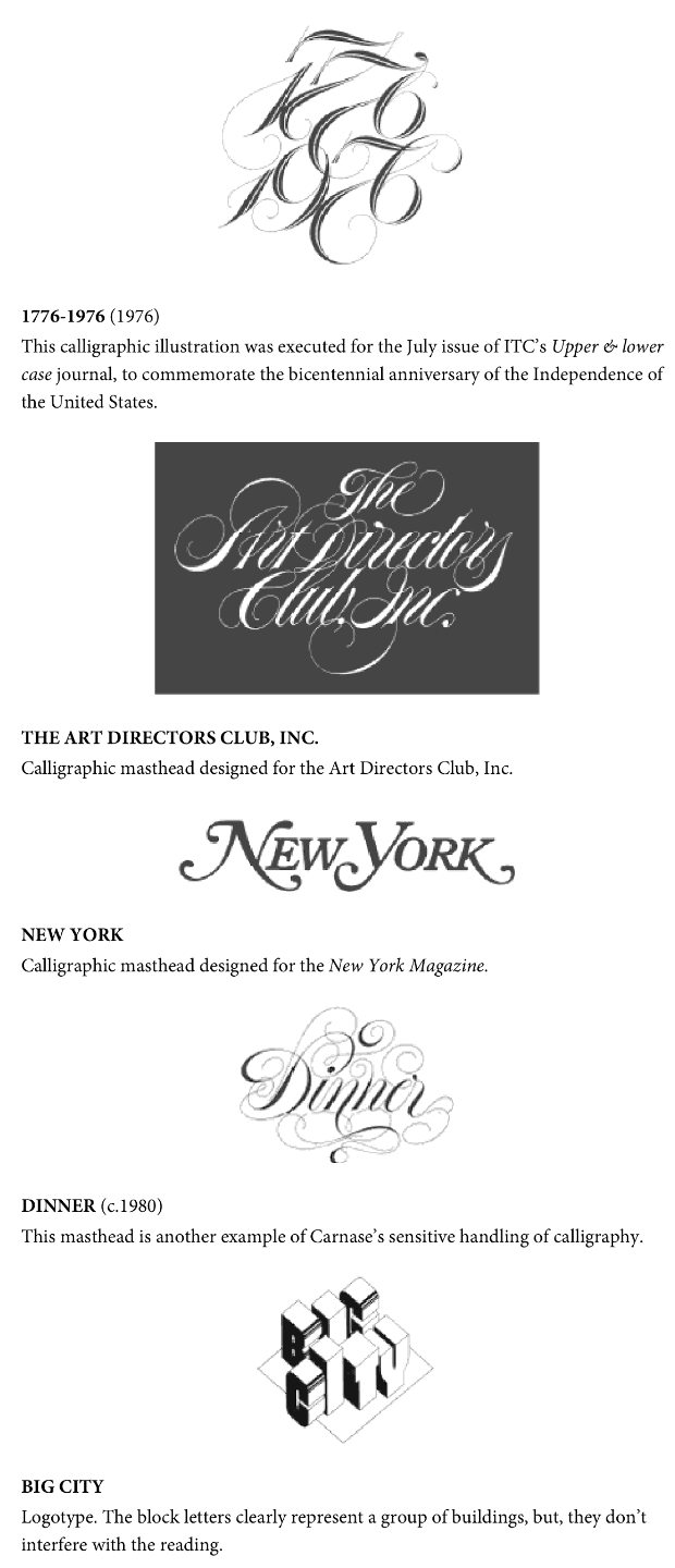 Thomas Paul Carnase was born in the Bronx, New York, on September 15, 1939. Following his graduation from the city's High School of Music and Art in 1957, he earned an associate bachelor of fine arts from New York City Community College in 1959. His career as a graphic designer, lettering artist, type and logo designer, typographer, and art director developed through his work with the firms Sudler & Hennessey, Inc. (1959-1964), Bonder & Carnase Studio, Inc. (with Ronné Bonder, 1965-1969), Lubalin, Burns & Company, Inc. (with Herb Lubalin and Aaron Burns, 1970), and Lubalin Smith Carnase, Inc. (1969-1979), the latter a partnership with designers Herb Lubalin and Ernie Smith. In 1979 he founded Carnase Inc. and Carnase Computer Typography, and in 1981, the World Typeface Center, Inc. The designer of more than fifty typefaces and corporate logos, Tom Carnase regularly entered, as well as judged, international design competitions, and was a popular guest lecturer for schools and professional groups around the world. Carnase was also the editor of the design journal Ligature published by the World Typeface Center from 1982 to 1987